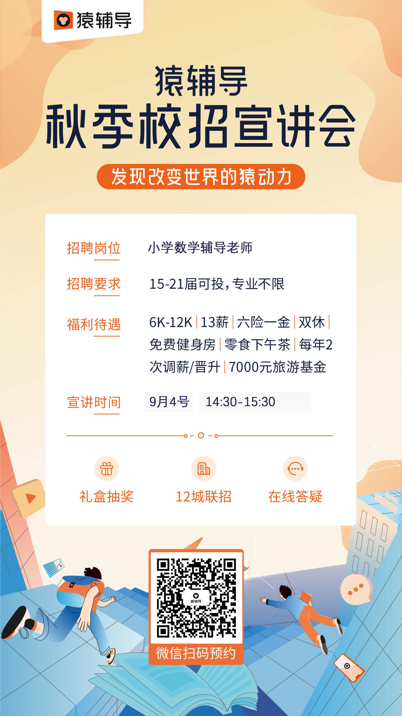 招聘岗位:在线班主任,小学数学辅导老师专业要求:专业不限,意向猿辅导的同学都可以来参加