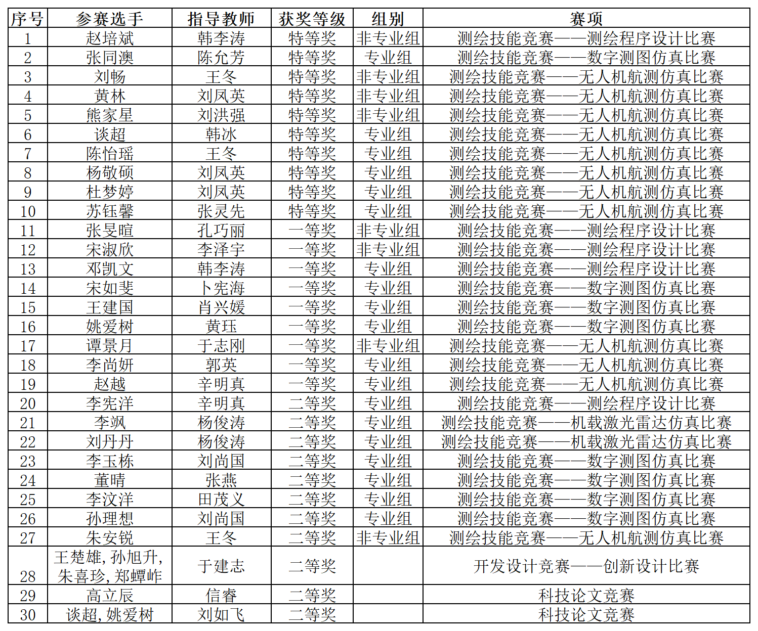 此次成绩的取得,是我院不断提高学生创新能力、推进产教融合的生动实践。下一步,学院将深化学生创新实践能力培养,落实“以赛促教、以赛促学、以赛促创”的理念,不断激发测绘学子的创新潜能与创业热情,为行业发展培育更多新时代测绘人才。(通讯员:韩冰)