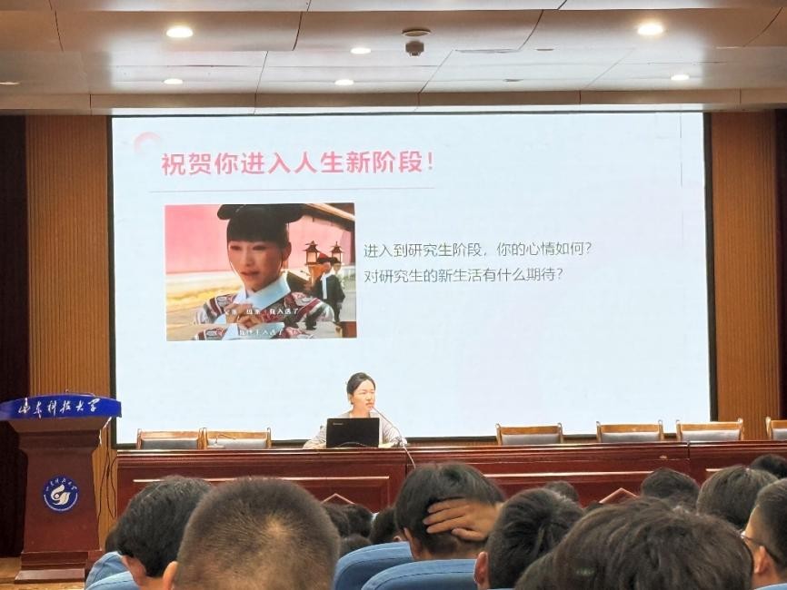 2025级研究生心理健康专题讲座在J6-434报告厅顺利举行。本次讲座以“新生引航,心向阳光”为主题,邀请心理健康教育中心赵铭担任主讲人,2025级研究生辅导员孙金香以及全体研究生新生共同参与。赵铭从学业困扰、师生关系、心理知识普及、呼吁主动求助这四个篇章展开讲解,旨在助力新生破解适应难题,以健康心态开启研究生生涯。
