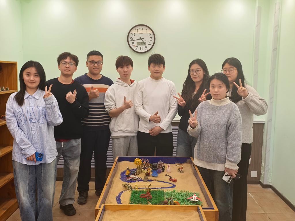 活动伊始,赵铭向同学们系统介绍了沙盘游戏的基本理念与操作流程,引导大家在一个安全、自由、受保护的空间中,借助沙具选择和沙形塑造,自然表达内心世界。在轻松愉悦的氛围里,同学们依次挑选心仪的沙具,共同搭建起富有象征意义的沙盘场景。从创意构想到故事分享,每个环节都让大家在沉浸式体验中加深了对自我和他人的认知,也学会了倾听与共情。