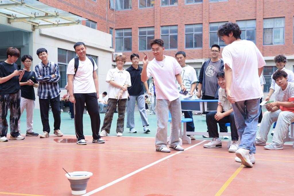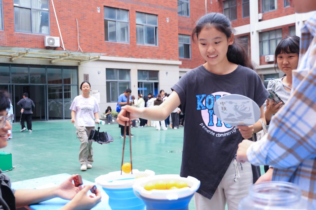 本次游园活动设置了多项传统文化体验环节,将中秋文化元素与互动游戏巧妙融合。在“拓扇映月”活动中,同学们用空白团扇结合传统拓印工艺,亲手制作属于自己的中秋主题团扇,体验传统手工艺的魅力。“玉兔投月”环节将投掷趣味游戏与中秋主题相结合,让同学们在轻松愉快的氛围中了解传统文化。“海底捞月”挑战赛则注重团队协作,要求参赛者用长筷将象征圆月的乒乓球从水池中夹出,既提升了传统文化趣味性,又锻炼了同学们的协作能力。而“家书寄秋”环节鼓励学生提笔抒怀,以传统书信形式传递对亲人的思念之情。活动现场气氛热烈,同学们在动手创作和友好互动中,不仅感受到中秋佳节团圆温馨的氛围,更深刻体会到中华优秀传统文化的魅力。